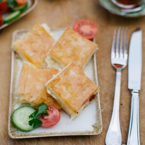 Eriyen bol peynirli, çıtırdayan yufkaları nefis tereyağı ve sıvı yağı karışımı ile kare kare lezzetine doyum olmuyor.