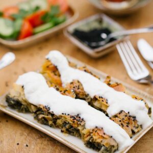 Ispanaklı tepsi böreğini şenlendirmek isteyenler için yoğurtlu ve bol baharatlı alternatif. Yoğurtla servis edilir, dilediğin baharat çeşidin ekleyerek zenginleştirir, lezzeti bambaşka hale çevirebilirsin.Mis gibi tereyağı ve sıvıyağ ile tadına doyum olmaz.